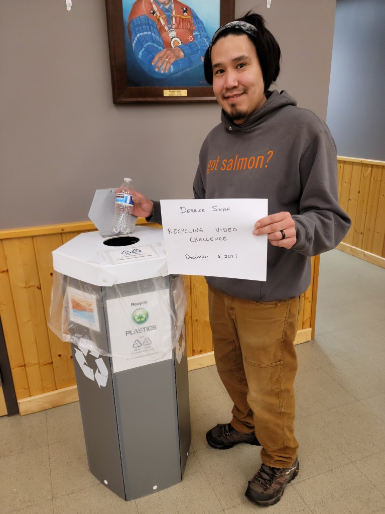 In this example, Derrick is recycling. The challenge was to show yourself recycling. He wrote his name, the challenge video, and the date.
